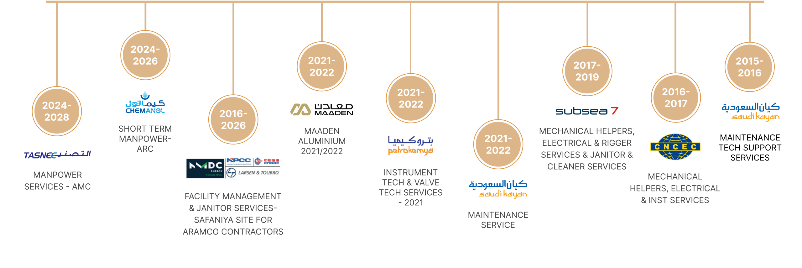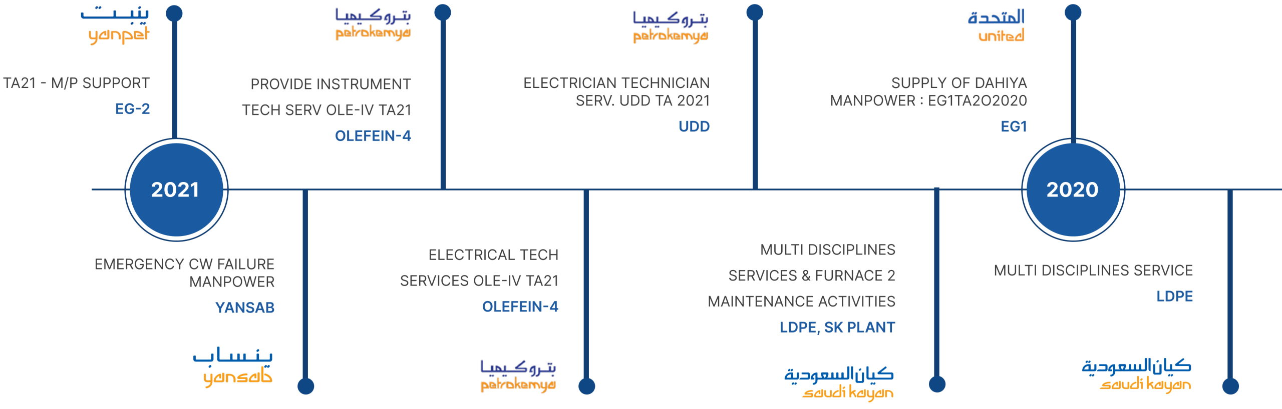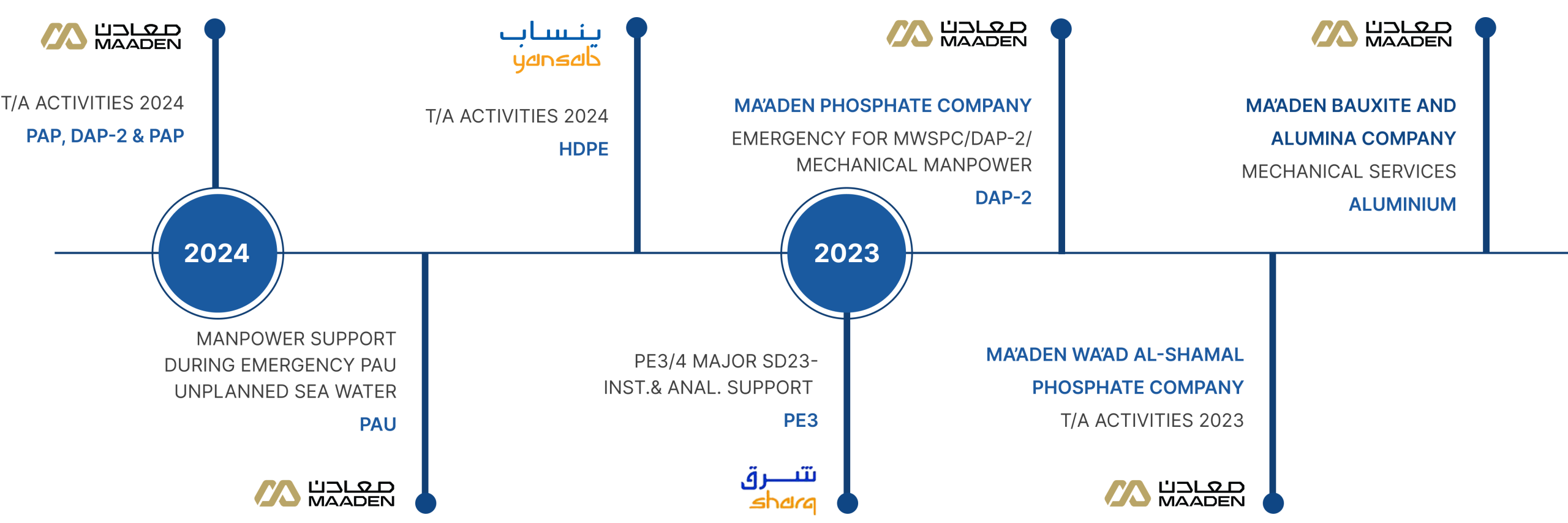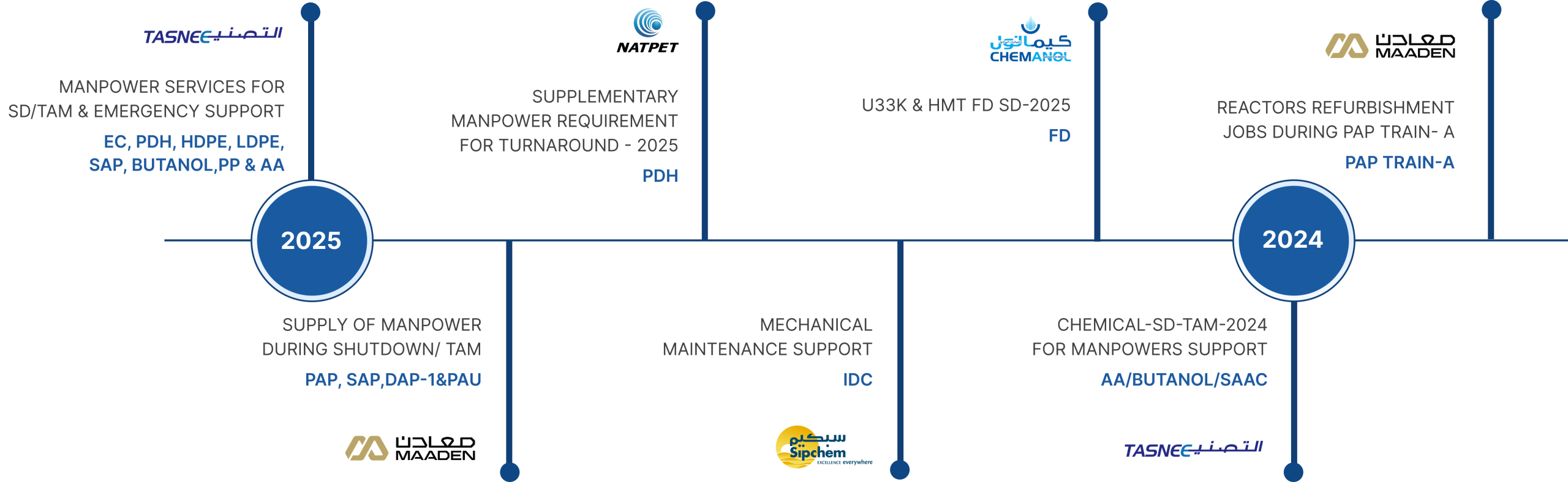 TASNEE, CHEMANOL, MAADEN, PETROKEMYA, SAUDI KAYAN, NMDC/NPCC& L&T providing ongoing support in maintenance, instrumentation, electrical, and manpower services.