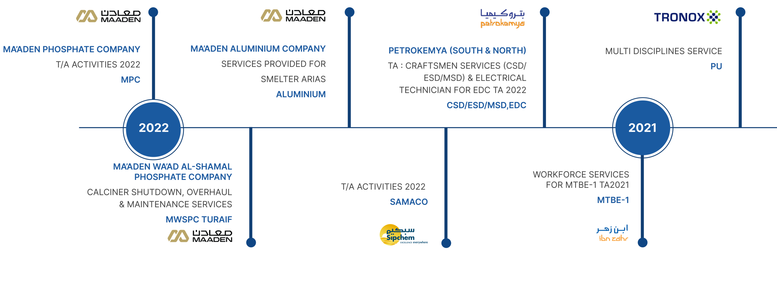 Successfully executed multiple Turnarounds (TAM) and emergency shutdown projects with SABIC affiliates ,TASNEE,MAADEN, TRONOX, SIPCHEM, NATPET, and more.
